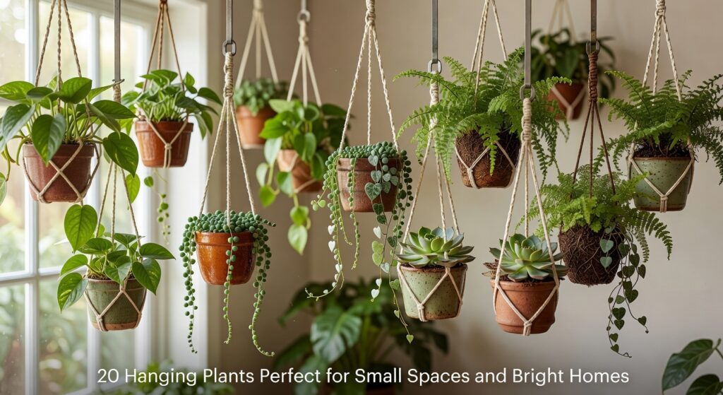 Like a tiny jungle gym for your windowsill, hanging plants turn cramped corners into lively retreats. Pick light‑weight vines like Pothos or String of Pearls for bright spots, and low‑light champs such as Boston Fern for dimmer nooks. Mix in air‑purifying Spider Plants or colorful Peperomia for texture without crowding. Choose species that trail gracefully, need minimal care, and fit your décor. Ready to discover 20 perfect picks that fit any small, sunny home?